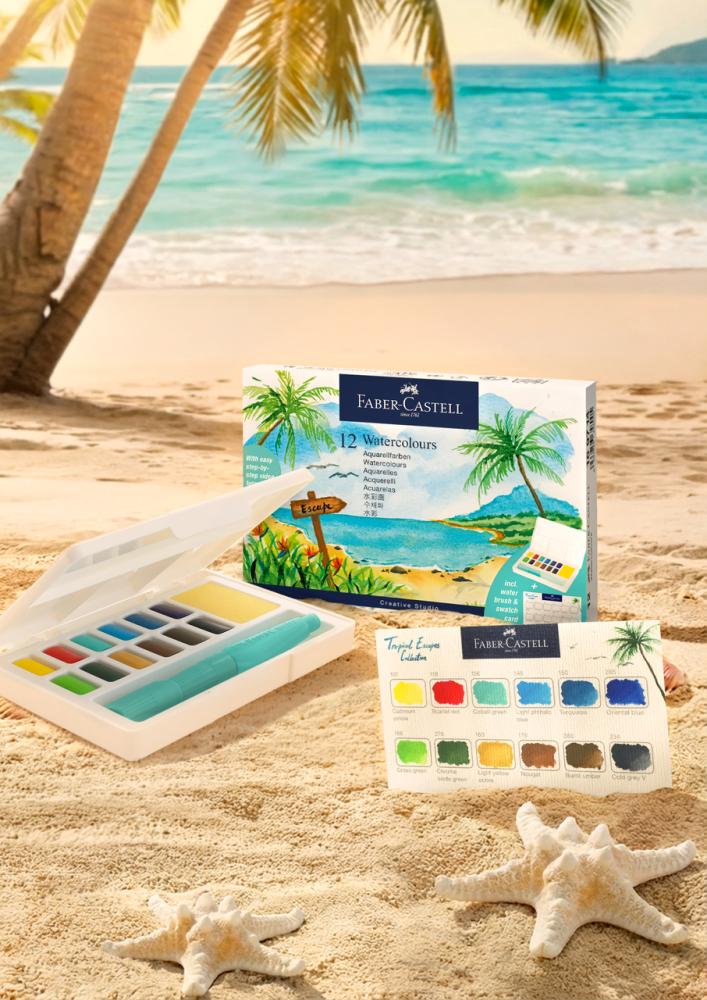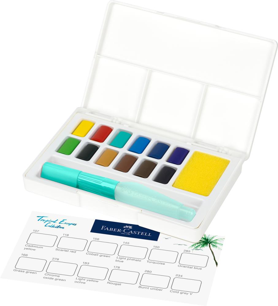 Kolekcia Tropical Escape: inšpiratívne tropické motívy sa stretávajú s jednoduchými a upokojujúcimi aktivitami s akvarelom. Koncept Kreatívneho štúdia umožňuje ambicióznym umelcom plne sa vyjadriť a vychutnať si svoju kreativitu s ďalším produktom, ktorý uspokojí všetky potreby. Sada všetko v jednom: 12 tropických akvarelových odtieňov v panvičkách vrátane tyrkysového štetca so stredne hrubým hrotom a nádržkou na vodu. Súčasťou je vzorkovník na testovanie farieb. Ideálny spoločník na cestách. Vysoko pigmentované farby úplne rozpustné vo vode. Jasné aj tmavé odtiene. Výborne sa miešajú