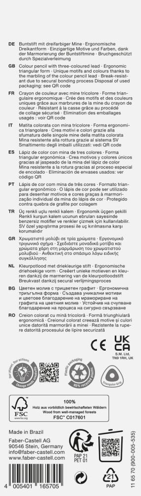 Viacfarebná ceruzka pre prekvapivú zábavu pri vyfarbovaní a kreslení. Štandardná ceruzka s trojfarebnou tuhou vytvára jedinečné motívy a farby vďaka individuálnemu mramorovaniu. Každá ceruzka je jedinečná a pri kreslení vytvára prekvapivý efekt. Farebné oddiene sú špeciálne vybrané učiteľmi výtvarnej výchovy. Ergonomický trojuholníkový tvar poskytuje lepšiu kontrolu a pohodlie pre detské psty. Hladká tuha s minimálnym odlupovaním poskytuje perfektné krytie. Drevo je z udržateľného lesníctva. 3 ks na blistri.