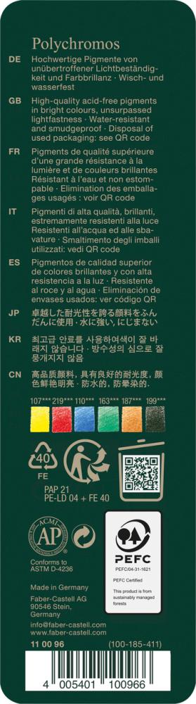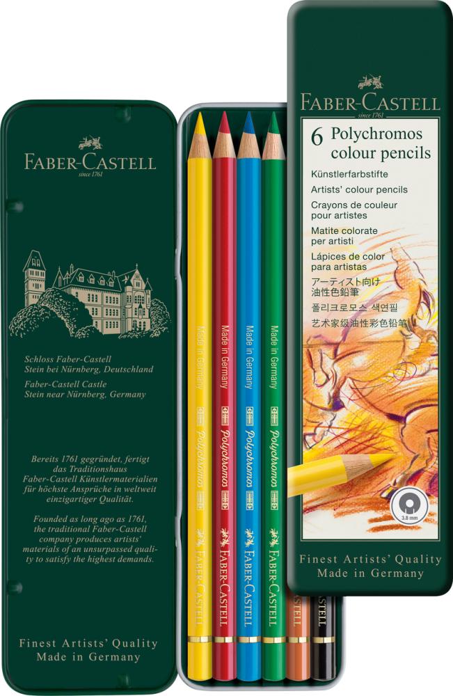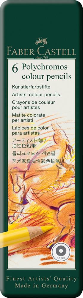 Umelecké pastelky Polychromos sú medzinárodne oceňované v kruhu profesionálov aj amatérskych nadšencov pre ich neprekonateľnú kvalitu. Vysoké štandardy kvality pasteliek sa prejavujú pri všetkých umeleckých štýloch, či ich použijete na grafiku, voľný štýl alebo presné zakreslovanie plánov. 250 ročná skúsenosť spoločnosti Faber-Castell a vysoká kvalita vstupných materiálov zaručuje pastelkám Polychromos odolnosť proti lámaniu, maximálnu svetlostálosť a optimálne nanášanie farieb. Tuha s hrúbkou 3,8 mm je odolná voči rozmazaniu. Vysokokvalitné pigmenty zaručujú vynikajúcu svetlostálosť. Tuha je nelámavá vďaka špeciálnemu lepeniu (SV). 6 farieb v plechovej krabičke.