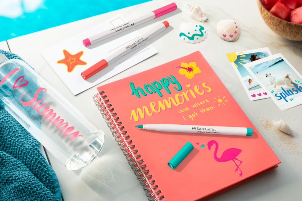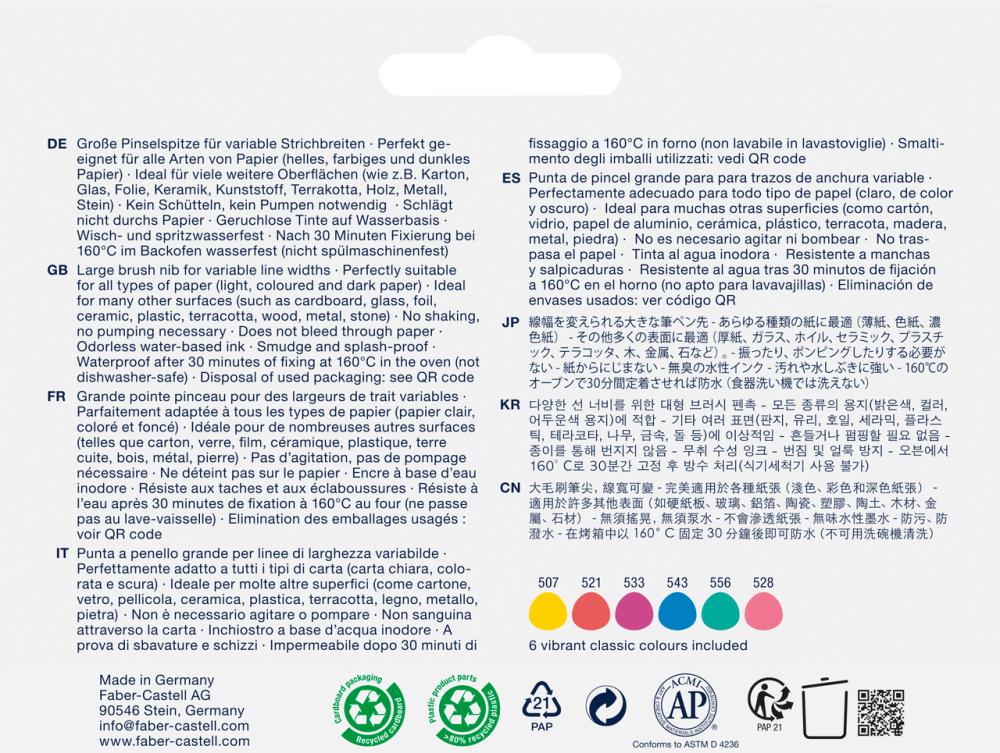 Kreatívny fix Goldfaber, s veľkým štetcovým hrotom pre variabilnú šírku čiary; Univerzálny nástroj pre mnoho kreatívnych projektov; Perfektne vhodný pre všetky druhy papiera (svetlý, farebný a tmavý papier); Ideálny pre mnoho ďalších povrchov (ako je kartón, sklo, fólia, keramika, plast, terakota, drevo, kov, kameň); Netreba trasieť ani pumpovať; Nepresakuje cez papier; Atrament na vodnej báze bez zápachu; Odolný voči rozmazaniu a striekajúcej vode; Vodotesný po 30 minútach fixácie pri 160 °C v rúre (nie je vhodný do umývačky riadu); Farby: 507 hello sunshine, 521 watermelon, 533 hot magenta, 543 ocean blue, 556 Caribbean blue, 528 candy pink