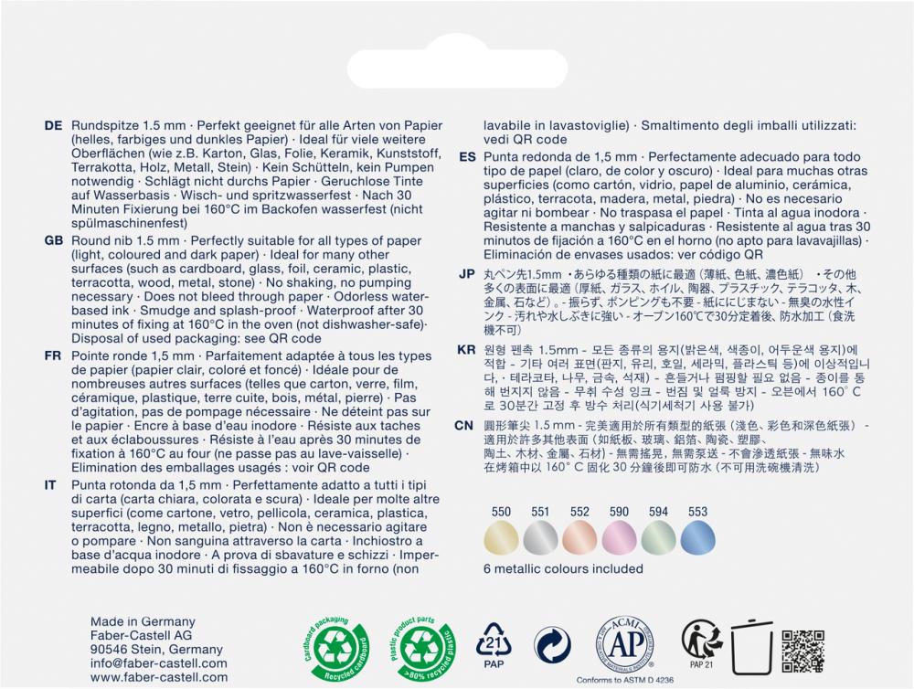Kreatívny fix Goldfaber s okrúhlym hrotom 1,5 mm; Univerzálny nástroj na mnoho kreatívnych projektov; Perfektne vhodný pre všetky druhy papiera (svetlý, farebný a tmavý papier); Ideálny pre mnoho ďalších povrchov (ako je kartón, sklo, fólia, keramika, plast, terakota, drevo, kov, kameň); Nevyžaduje trasenie ani pumpovanie; Nepresakuje cez papier; Atrament na vodnej báze bez zápachu; Odolný voči rozmazaniu a striekajúcej vode; Vodeodolný po 30 minútach fixácie pri 160 °C v rúre (nevhodný do umývačky riadu); Farby: 507 hello sunshine, 521 watermelon, 533 hot magenta, 543 ocean blue, 556 Caribbean blue, 528 candy pink